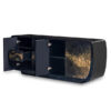 - ESTELLA Sideboard demonstrates how furniture entirely made of lacquer can be timelessly stylish. Its cabinet frame is finished with black lacquer while its door fronts are finished with beautiful black and gold lacquered artwork. ESTELLA adds a sophisticated touch to a living room or dining room. Its interiors comprise 8 storage compartments and 2 internal drawers lined with black velvet.
