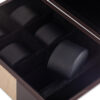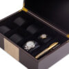 - Watches are stored and displayed on faux-leather cushions in dedicated slots. Pens also have their special storage slot. The box can store up to 6 watches and 3 pens.